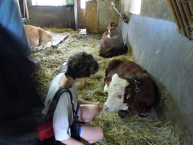 Madame Rebuffet et son fils Nicolas, ancien élève de STAV à Saint-Ismier, associés au sein du GAEC Rebuffet des Crêts, labellisé Agriculture Biologique, nous ont accueillis afin de nous faire partager leur passion, mais aussi les difficultés du métier. La complémentarité polyculture-élevage, les contraintes et atouts de l’agriculture de montagne (dans un fort contexte de néo-ruralité), la transformation et la commercialisation des produits agricoles ont été au cœur des débats et des questions des élèves. Les visiteurs ont été ravis des contacts concrets avec les différentes races de vaches (allaitantes, blondes d’Aquitaine, croisées, salers et limousine, et laitières, abondance et tarine). Les élèves ont été impressionnés par la détermination nécessaire pour continuer à faire vivre cette agriculture et par la diversité des compétences à maîtriser.