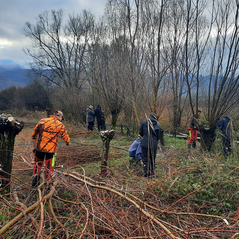 Au programme de leur journée de chantier : la taille des saules en têtard et le débroussaillage des prairies pour rouvrir le milieu pour la croissance de la sanguisorbe.