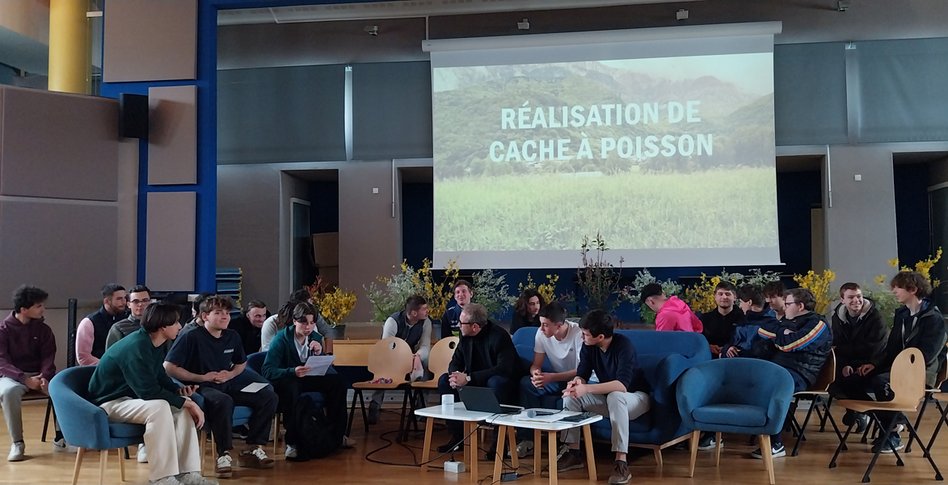 Les terminales Gestion des milieux naturels et de la Faune nous ont présenté un travail réalisé en travaux pratiques. La mise en place d’une cache à poisson sur le ruisseau du Ruisset, affluent de l’Isère. Cette cache permettra de créer une zone de calme et de repos pour les poissons, comme la Truite fario, la Loche ou encore le Vairon, tous présents dans ce cours d’eau.