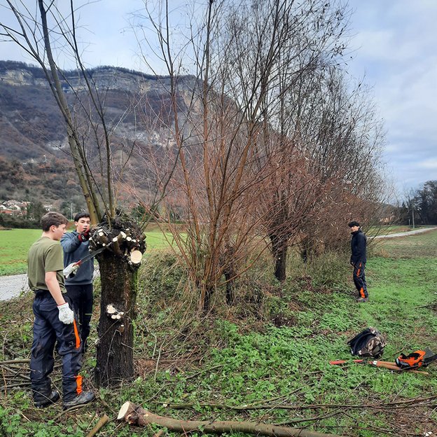 Au programme de leur journée de chantier : la taille des saules en têtard et le débroussaillage des prairies pour rouvrir le milieu pour la croissance de la sanguisorbe.